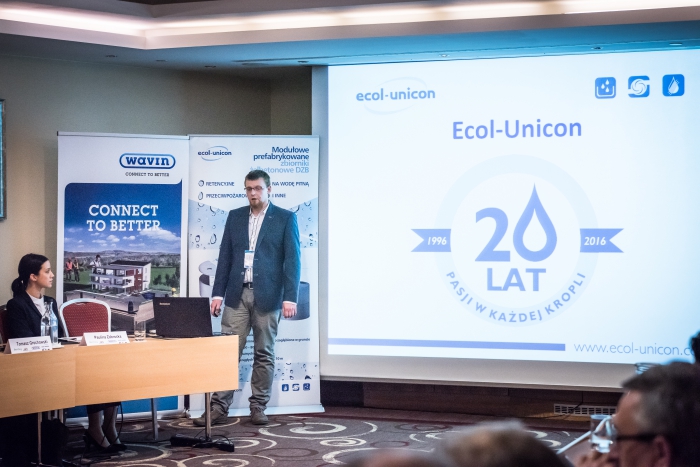 Przedstawiciel jednego ze sponsorów spotkania, Pan Szymon Mielczarek zaprezentował rozwiązania oraz systemy dedykowane retencjonowaniu wód opadowych, stosowane przez firmę Ecol-Unicon. Przy okazji tego tematu zwrócono również uwagę na brak wyraźnych zapisów zmuszających do odtwarzania naturalnej retencji zlewni, przez ekwiwalentną objętość zbiorników retencyjnych w przypadku nowych inwestycji uszczelniających zlewnie.