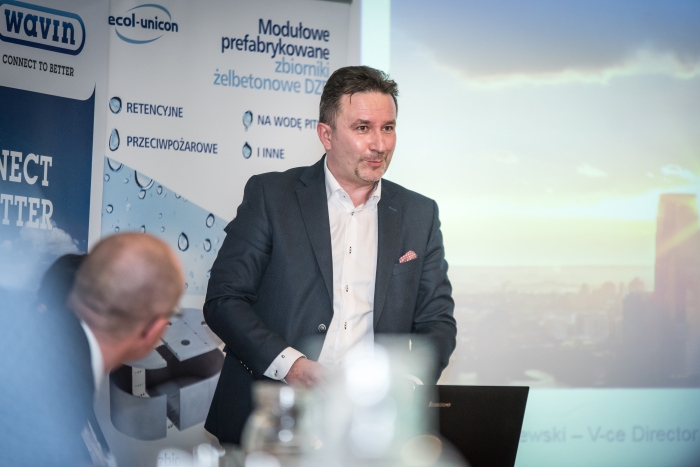 Podczas drugiej części spotkania zostały również omówione rozwiązania i systemy dedykowane rozsączaniu wód opadowych. W tym temacie uczestnicy spotkania mieli okazję wysłuchać ciekawej prezentacji Pana Roberta Uniejewskiego z firmy Wavin. Przy okazji tego tematu również zwrócono uwagę na aktualny brak zapisów zachęcających do rozsączania wód opadowych i alimentacji zmniejszających się zasobów wód podziemnych w przypadku tworzenia koncepcji odprowadzania wód opadowych.